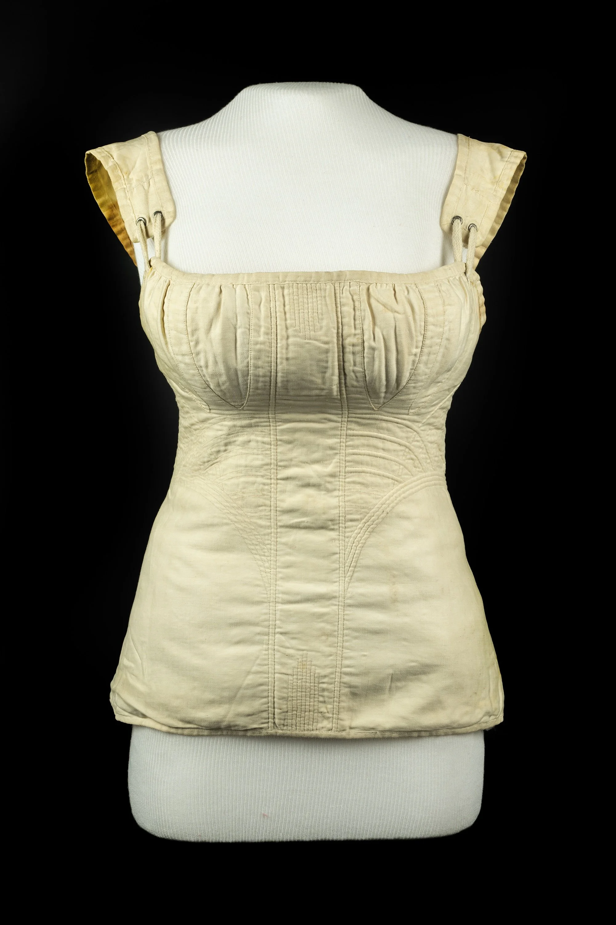This is impossible to date because it has no maker’s mark. This piece is entirely handsewn. Shown below is a recreation with a wooden busk, and an advertisement from 1828