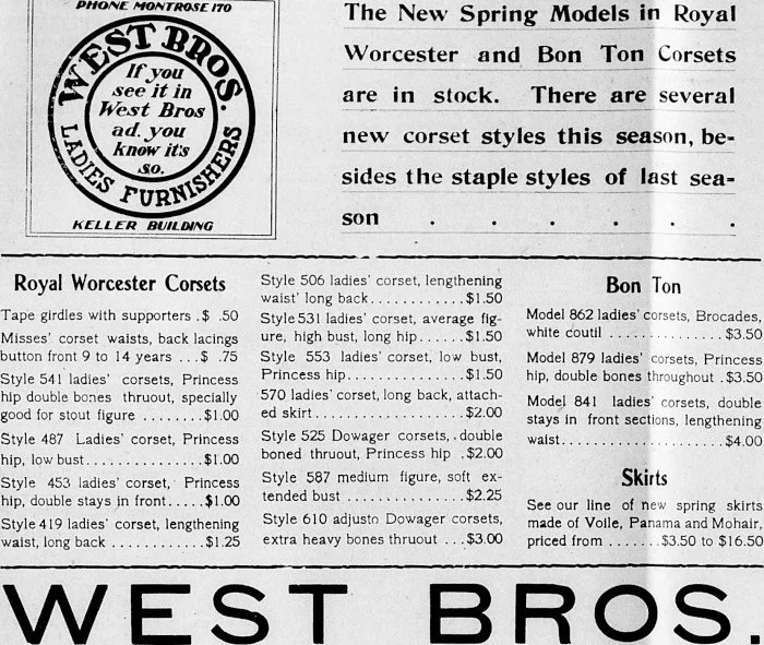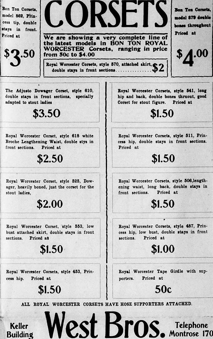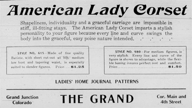 We dated this corset to about 1907-09, based on ads from Colorado Newspapers. Unfortunately, this model is too delicate to photograph on a mannequin.