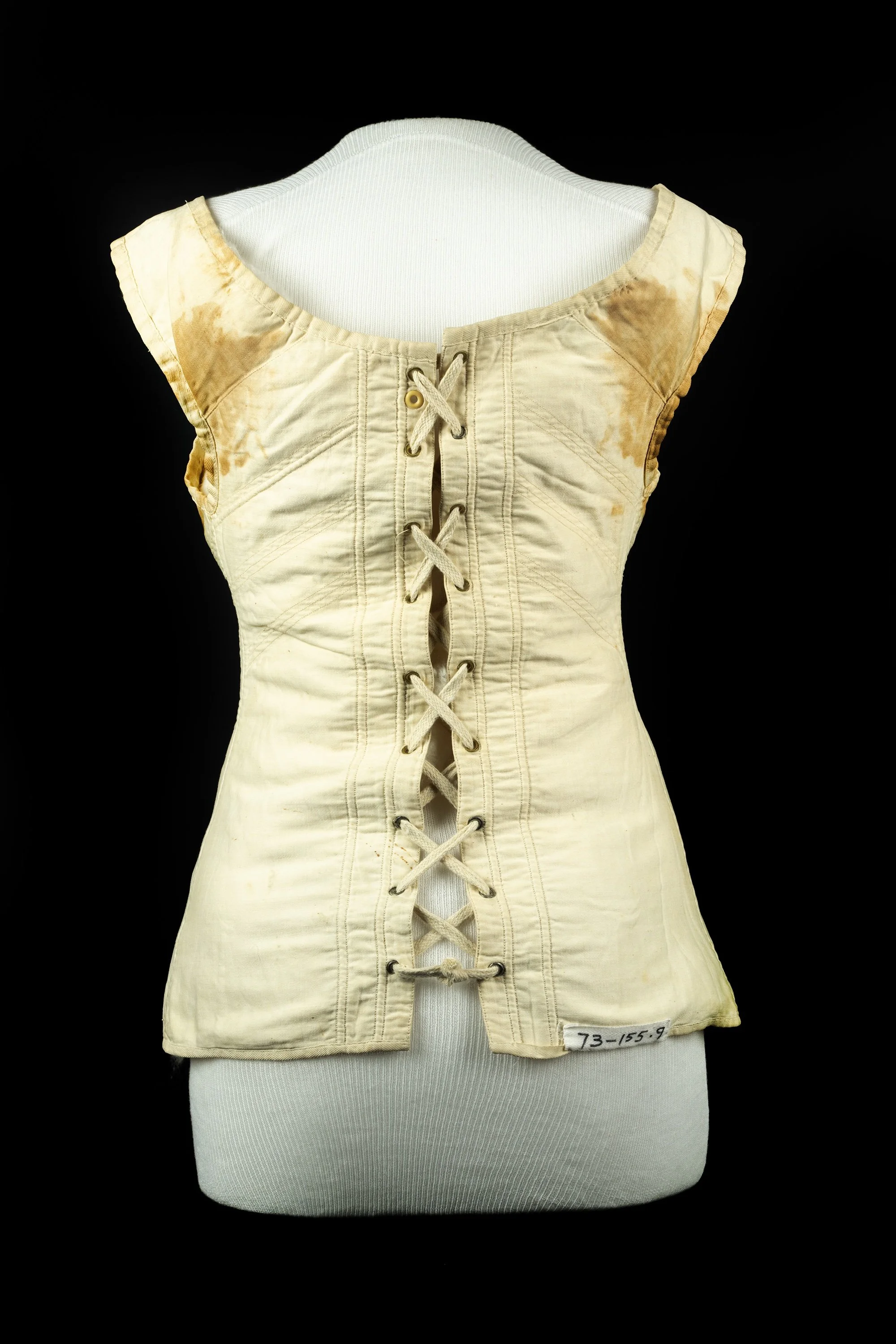 The grommets in the back are clustered at the waist and made to be tightened with two large loops. All grommets are metal and original to the piece, probably aluminum. The lacing may be original to the piece and has no aglets. There is a waist tape made of a diamond weave, a broken twill weave. The tape is probably cotton. The edges are finished with a tape cut on the straight grain made of a different fabric. The edges of this tape are extra long and tacked back clumsily. It is original to the piece.