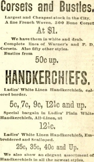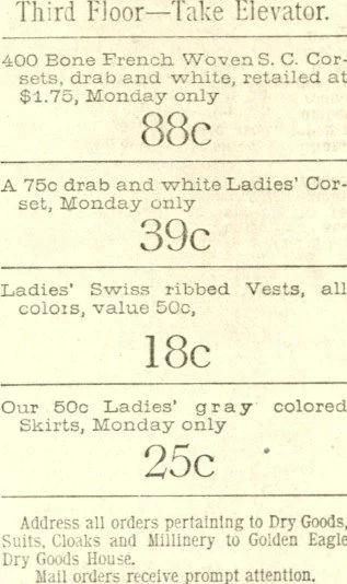 This is impossible to date because it has no maker’s mark. We know it was worn by a girl born in 1889. The style looks similar to the 1890s-1900s, so she probably wore it as a preteen. It has a 22” waist and looks unworn. Pictured is an ad from a 1900 newspaper.